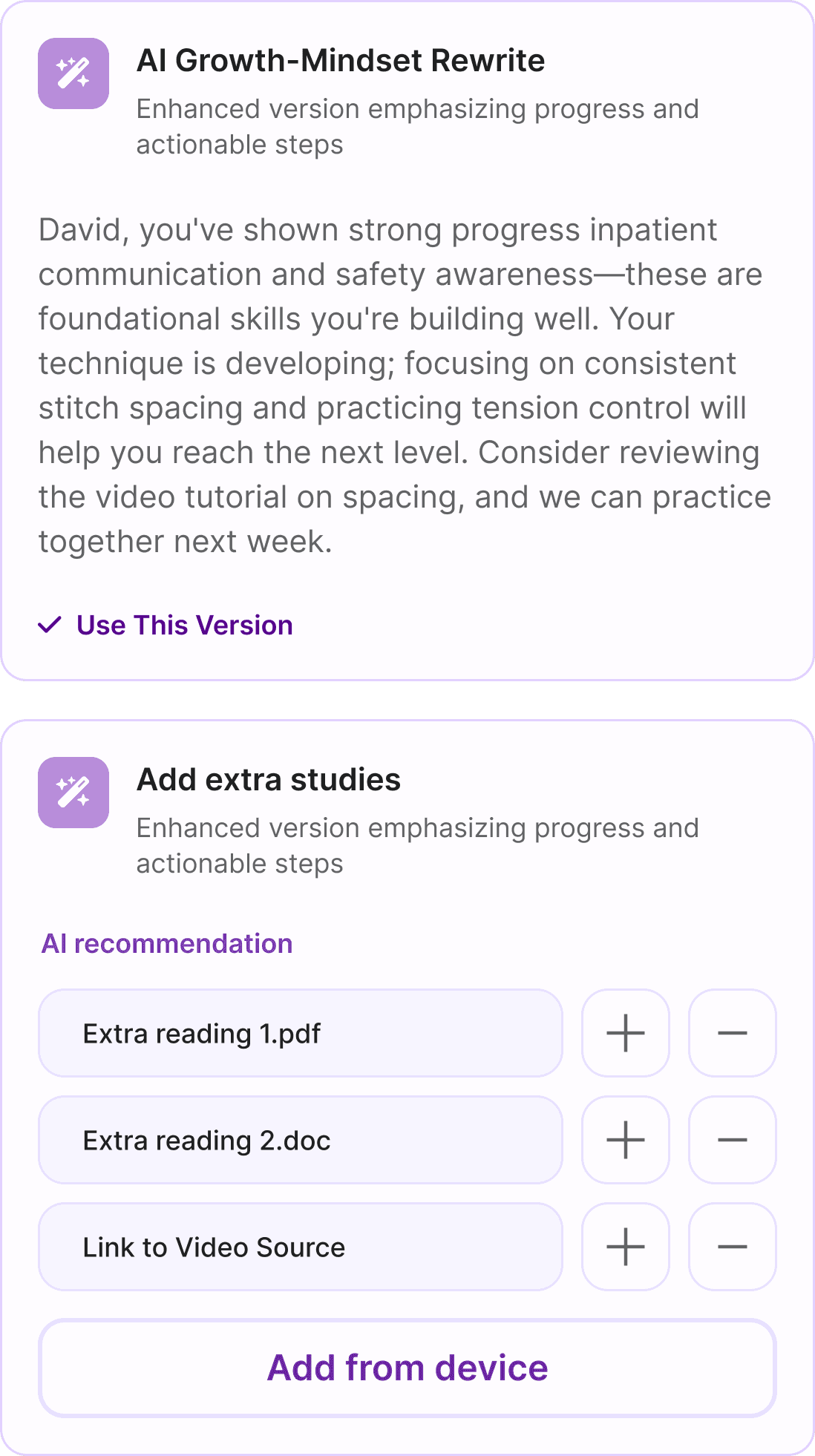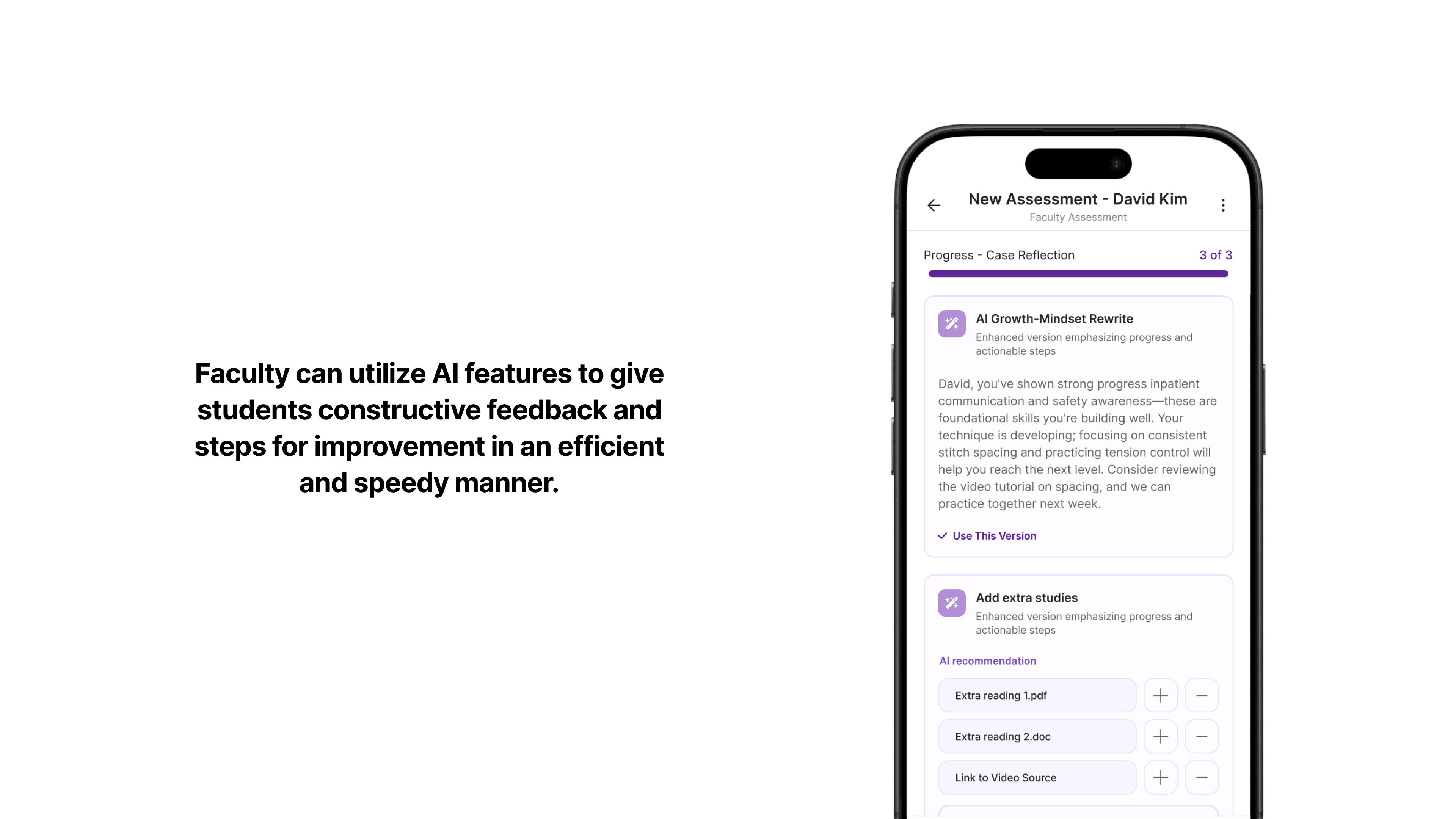 Our clients were interested in the use of AI within the EvalNow app. Through our literary review research and competitor analysis, we decided that the implementation of an "AI Growth-Mindset Rewrite" feature and an "Add extra studies," card would help faculty give constructive feedback that promotes growth within students to reduce the high emotional feelings associated with the existing feedback process. The rewrite summarizes the student's progress and recommends actionable steps for them to take. The "Add extra studies" cards supports the concept of giving students actionable steps by providing them real resources on the technical challenges they are facing.