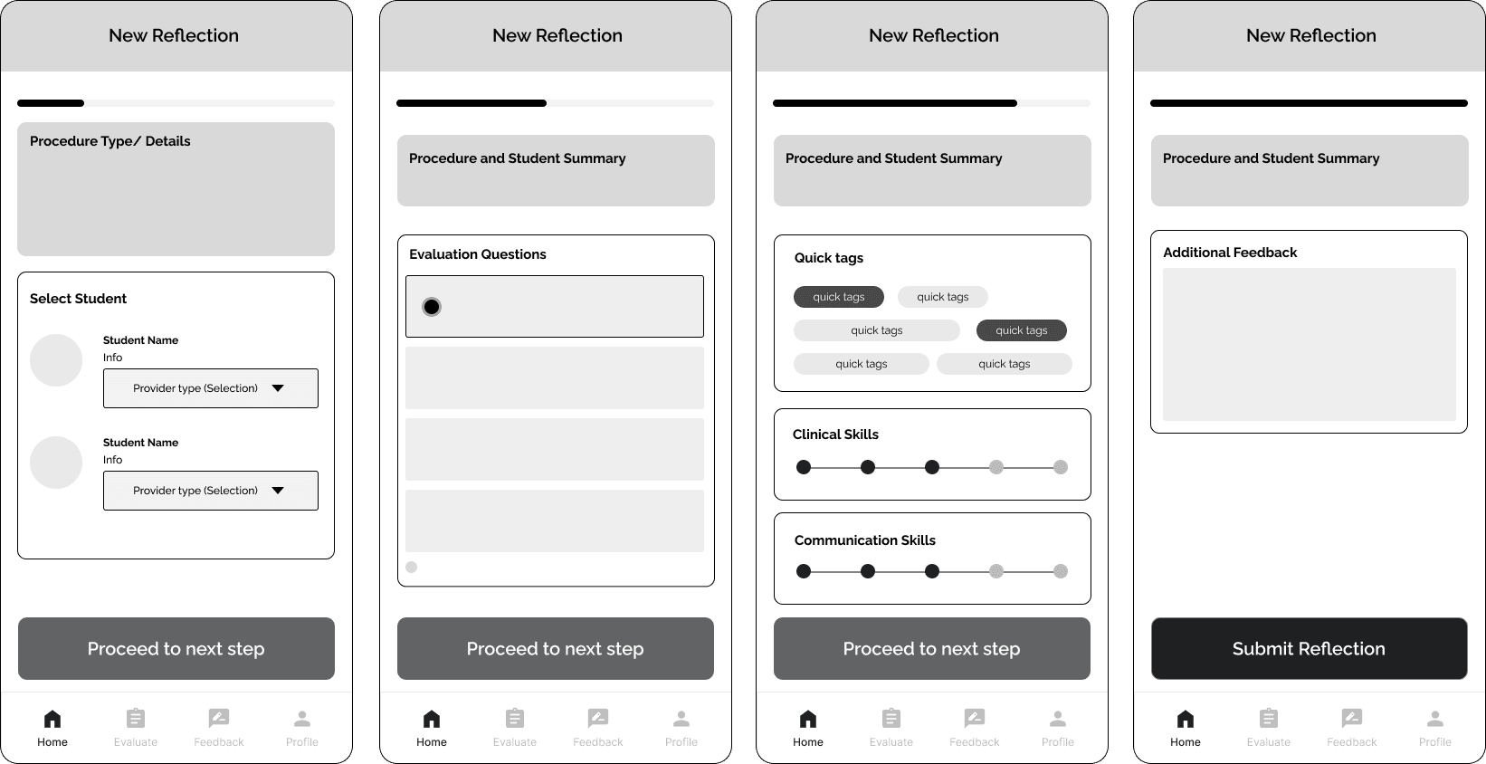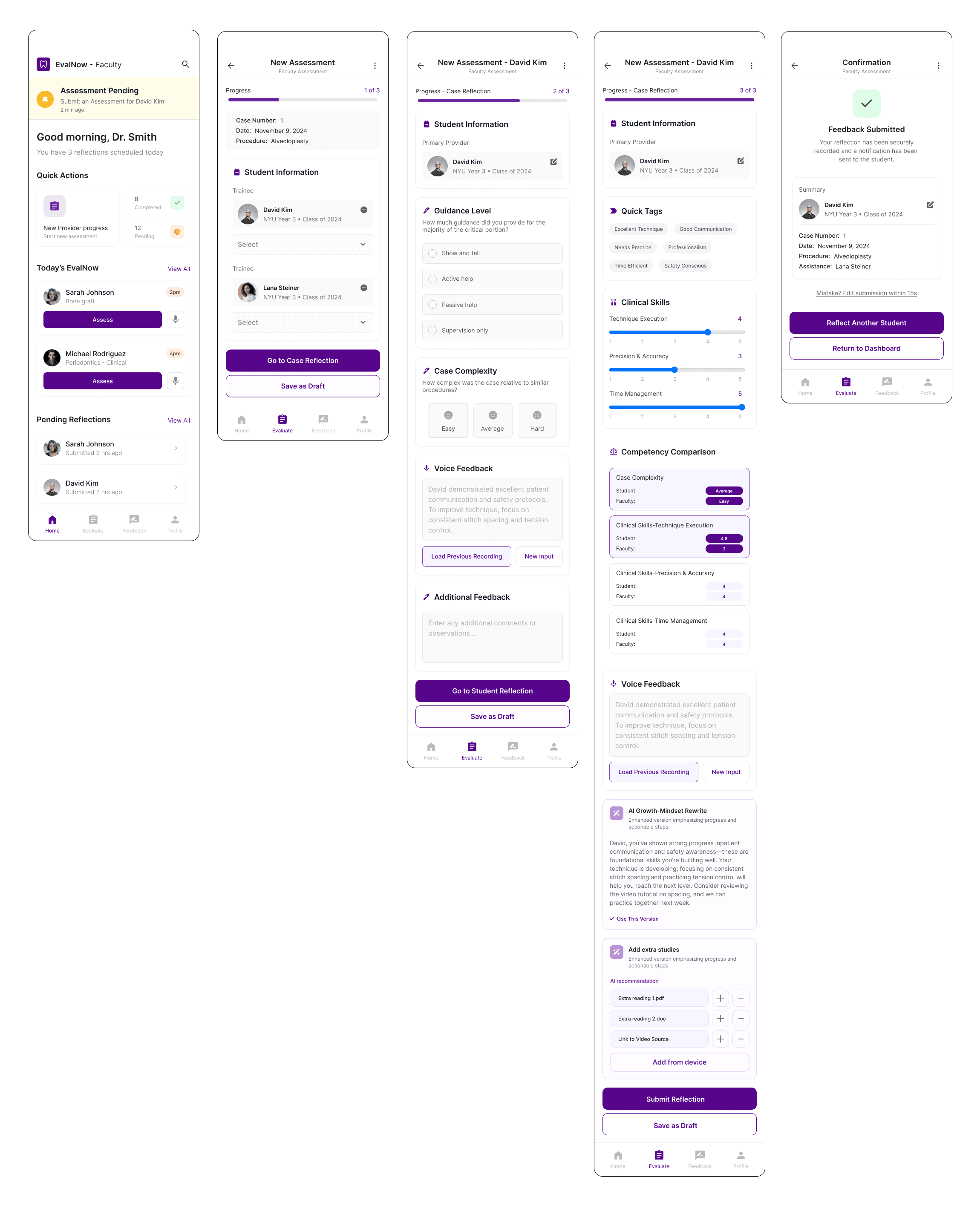 These high-fidelity screens illustrate the redesigned faculty assessment flow, from reviewing pending evaluations to submitting structured, growth-oriented feedback. The experience prioritizes speed and clarity through progressive disclosure, quick tags, voice input, and competency sliders, allowing faculty to capture insights efficiently during busy clinical sessions. AI-assisted rewrites and competency comparisons help translate observations into psychologically safe, actionable feedback, while draft states and confirmations support flexibility without disrupting workflow.