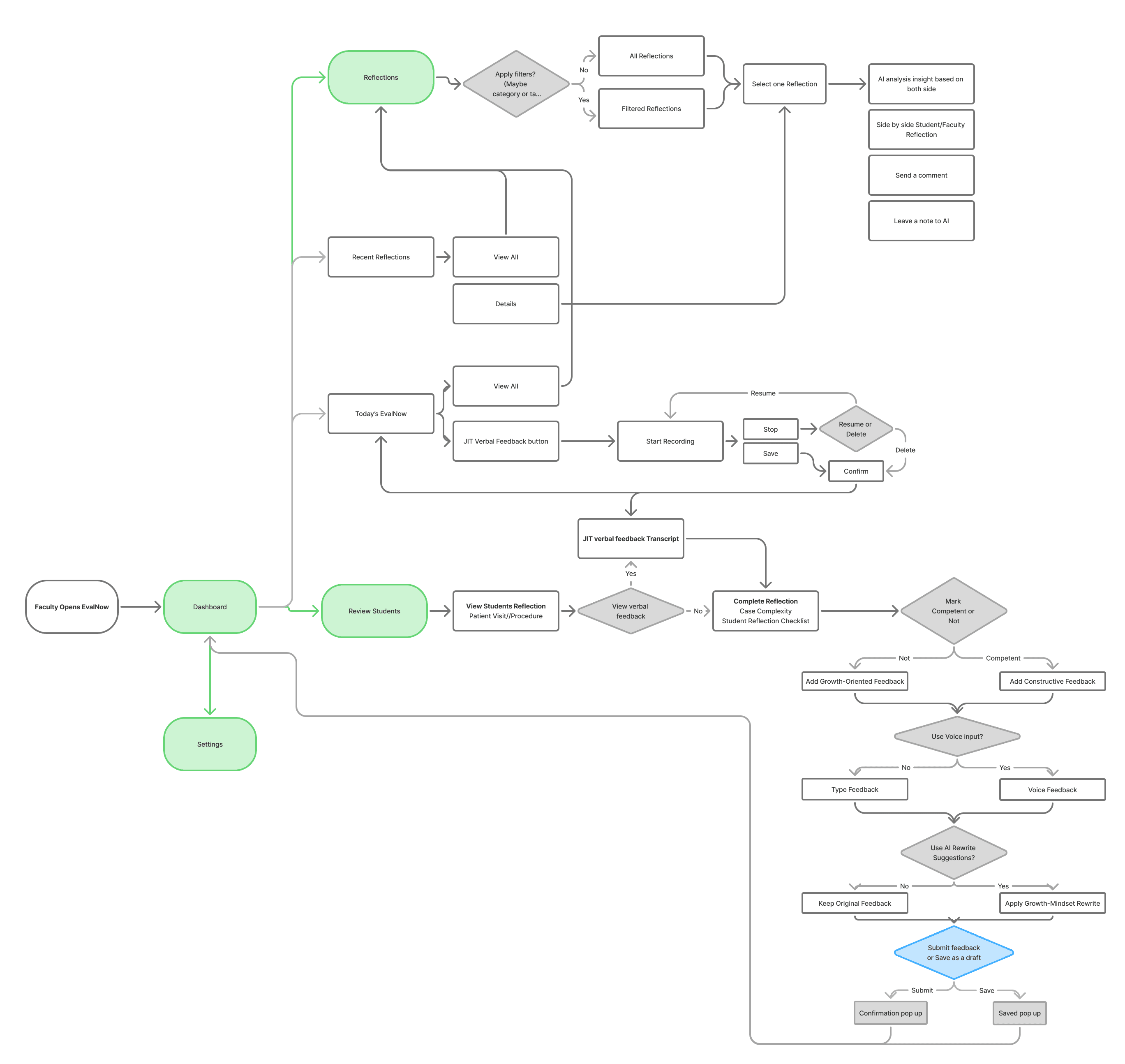 The user flow was created during the ideation phase to map how faculty might move through EvalNow as part of their real clinical routines. It explores end-to-end interactions, from reviewing students and capturing in-the-moment verbal feedback to reflecting on longitudinal insights and delivering structured, growth-oriented evaluations. The flow helped surface key design considerations around reducing cognitive load, supporting flexible feedback inputs (voice and text), and embedding reflection and AI assistance without disrupting clinical workflows, ultimately guiding early feature prioritization and system architecture decisions.