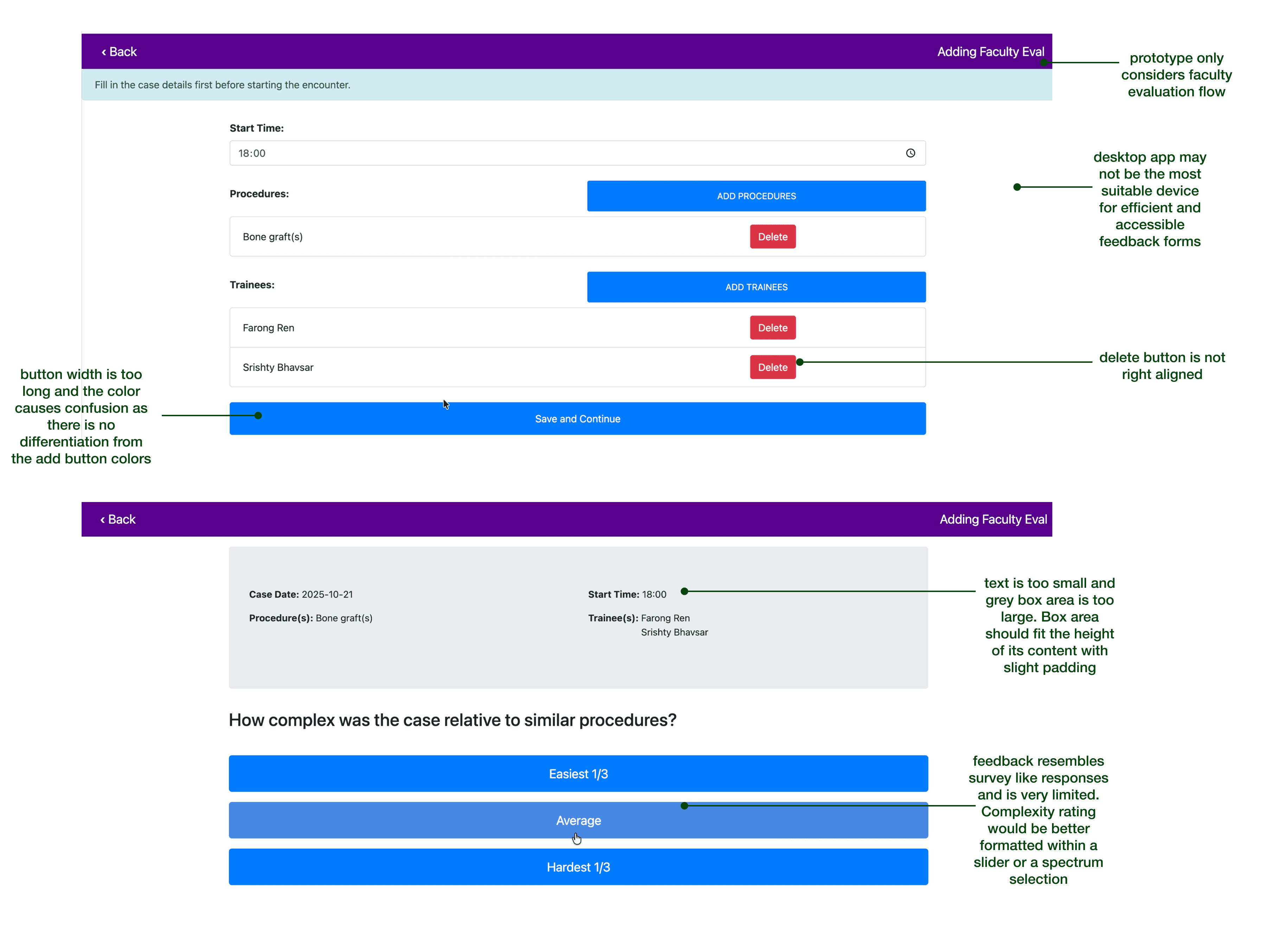 We concluded that the current EvalNow prototype was limited in its survey-like questions, lacked a student flow, and did not have a mobile-friendly format that would be intuitive for both students and faculty.